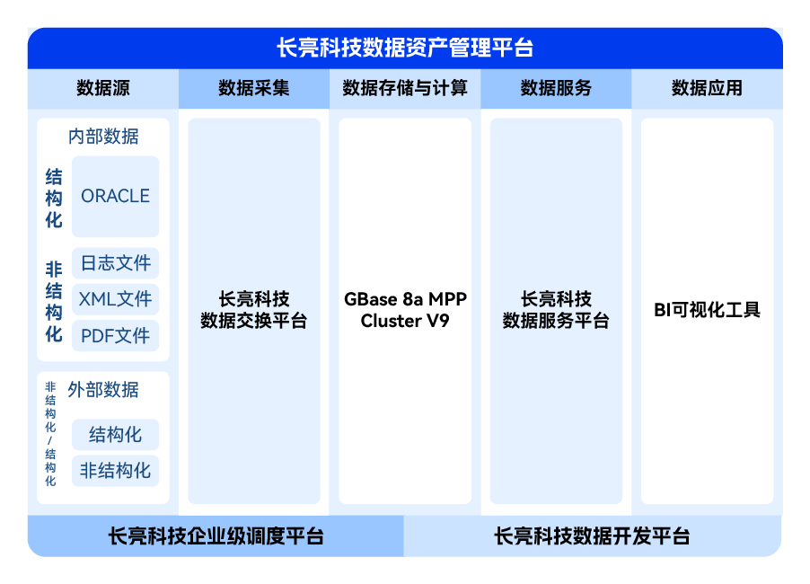 在該項目中,雙方基于南大通用GBase 8a MPP Cluster以及長亮科技數據開發、數據交換、企業級調度、指標管理、數據補錄等平臺產品的組合方式,為承德銀行搭建了HADOOP+MPP 混搭架構的基礎數據底座。其擁有數據采集、數據預處理、數據存儲、數據建模、數據分析、數據可視化等能力,可為全行數字化轉型提供數據支撐。