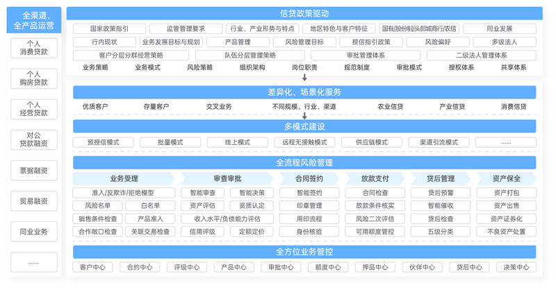 在業務應用層面,以“雙客”(客戶經理、客戶)為中心、線下產品線上化、場景數字化,對不同行業、類別、風險等客戶提供差異化服務,實現“千人千面”、“千人一面”,為客戶提供量身定制的信貸產品,滿足不同客戶群體的需求;通過無紙化、業務移動化、流程可視化,優化信貸業務流程,簡化辦理流程,提升精細化管理水平;以業務邏輯劃分各個獨立又互相協作的能力中心,包括客戶中心、產品中心、定價中心、額度中心、審批中心、評級中心、押品中心、貸后中心、核算中心等,支持金融機構以此為依托進行個人貸款、對公信貸、同業信貸、集團信貸、小微信貸、普惠業務、網貸業務(包括助貸、聯合貸、信用付)等各類貸款業務的產品創新和運營創新。