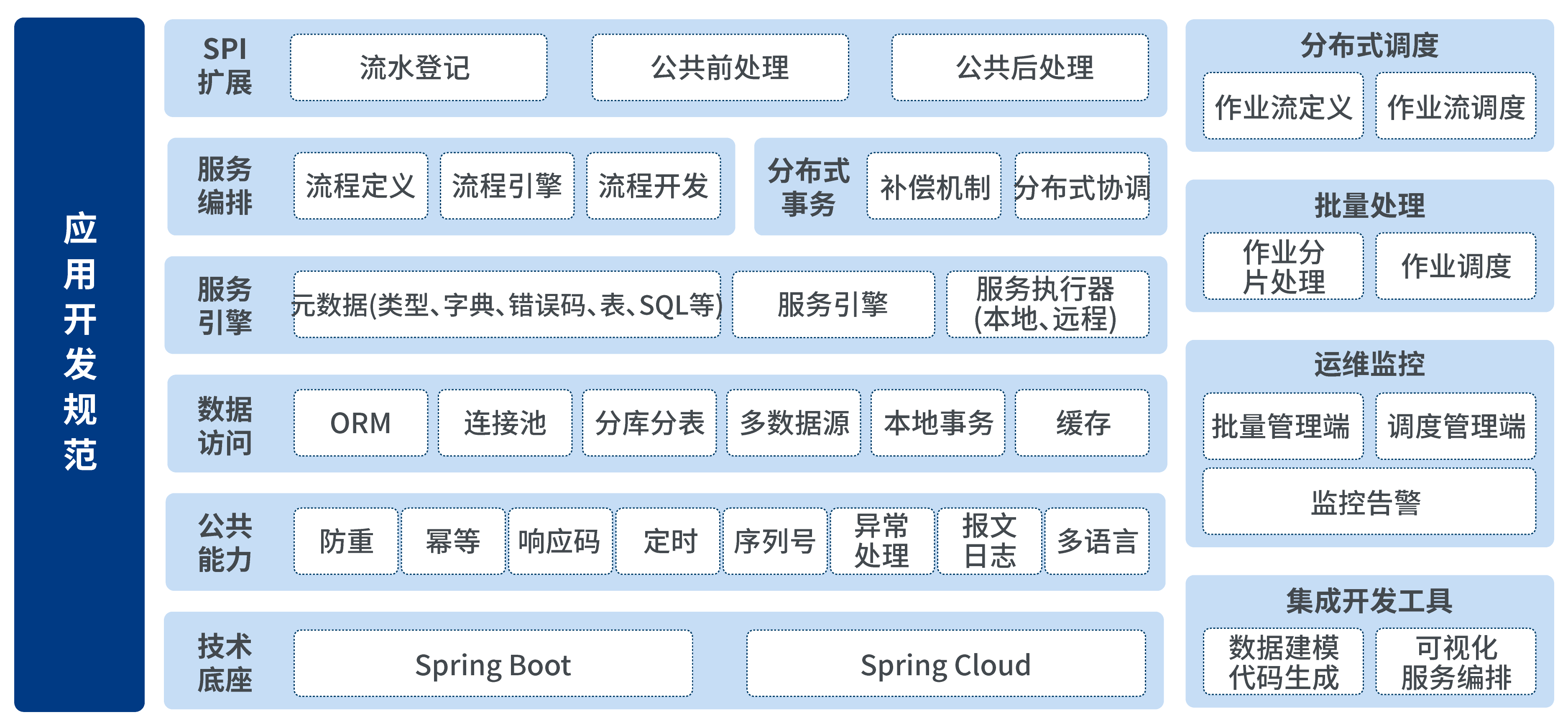 新一代金融應(yīng)用平臺(tái)總體架構(gòu)由聯(lián)機(jī)引擎(服務(wù)引擎、服務(wù)編排、分布式事務(wù)、元數(shù)據(jù)等)、批量引擎(分布式調(diào)度、批量處理)、公共能力(防重、冪等、序列號(hào)、數(shù)據(jù)訪問、SPI機(jī)制、技術(shù)底座等)、開發(fā)工具和開發(fā)規(guī)范組成。