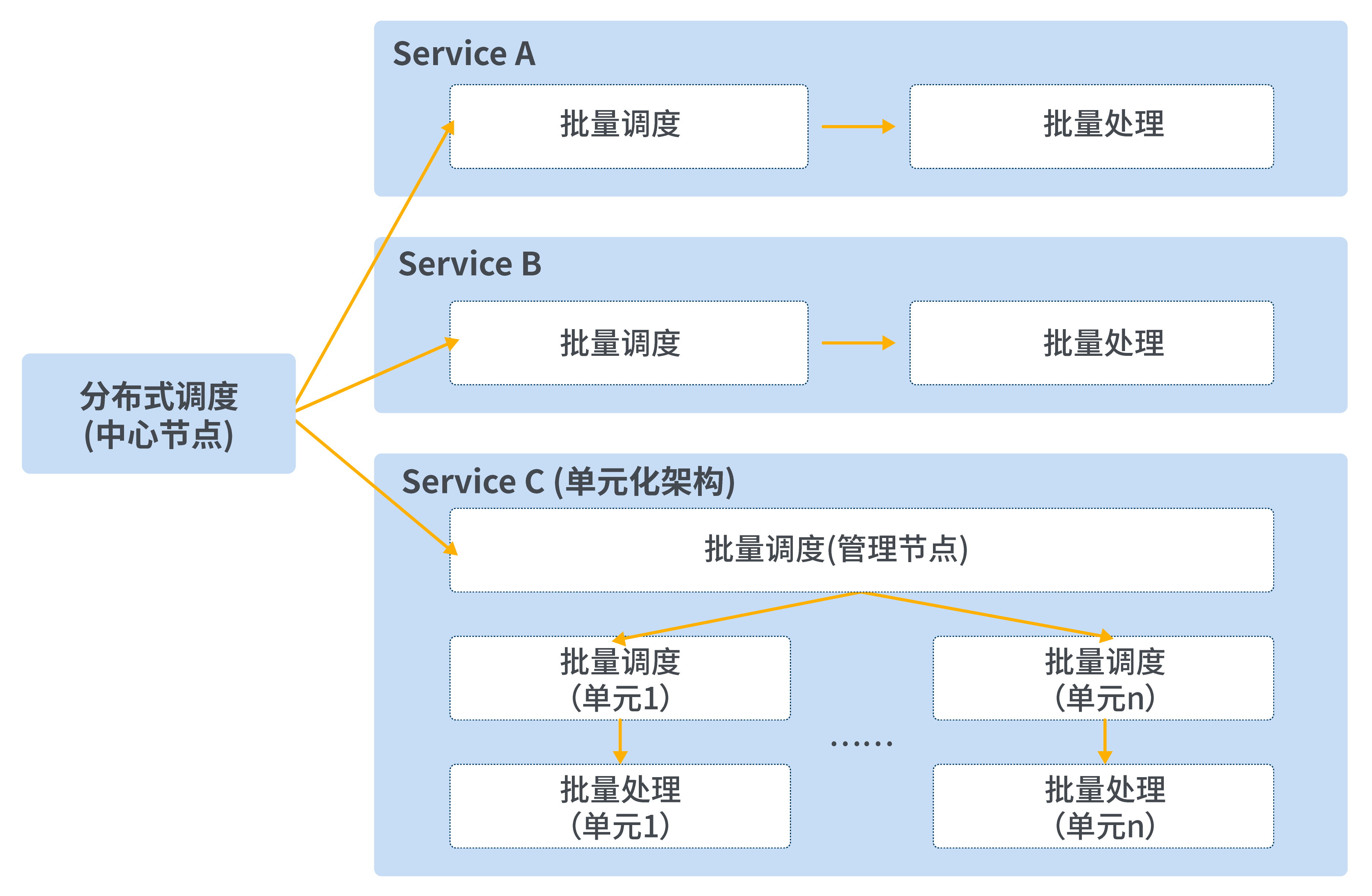 在復(fù)雜架構(gòu)(微服務(wù)+單元化)下,分布式調(diào)度需要支持去中心化調(diào)度能力,以降低主節(jié)點(diǎn)的調(diào)度壓力,將調(diào)度分散到每個(gè)微服務(wù),每個(gè)單元處理。