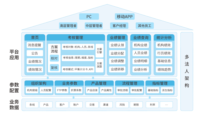 在產品架構上,幫助銀行在全行統一考核體系框架下,實現各級法人、分支機構、營業網點和人員的差異化考核,各個層級可以靈活配置考核指標和考核方案,把績效管理思路落地到信息化系統。