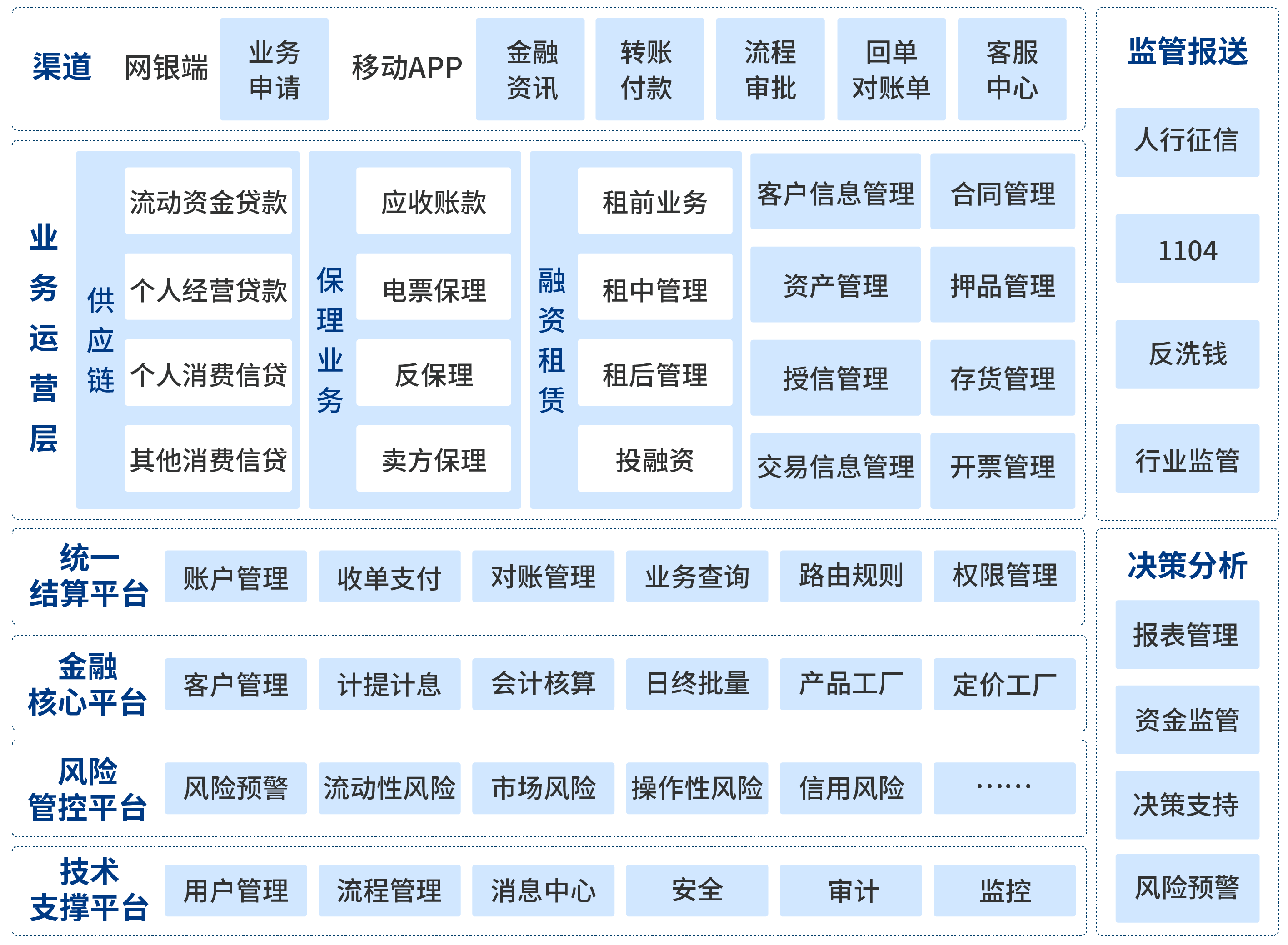 提供多元化的產品配置及業務支撐、全流程的業務閉環管理、差異化的客戶金融服務