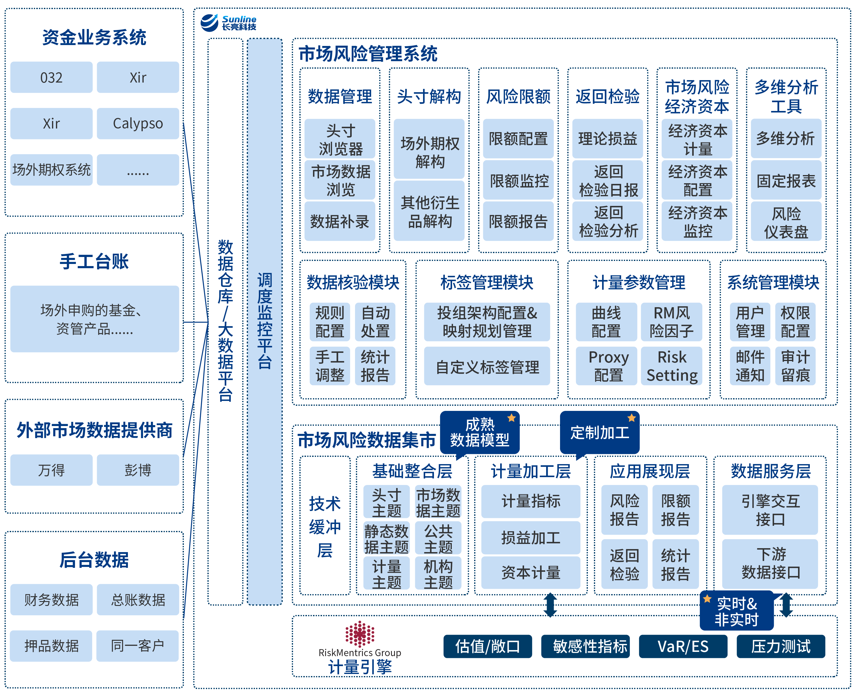 從各交易源系統(tǒng)、已建數(shù)據(jù)中心接入頭寸數(shù)據(jù)、市場數(shù)據(jù)、參考數(shù)據(jù),統(tǒng)一管控市場風(fēng)險數(shù)據(jù),建設(shè)支撐市場風(fēng)險管理需求的風(fēng)險數(shù)據(jù)集市;為新的市場風(fēng)險計量模型、金融產(chǎn)品估值模型預(yù)留接口,支持未來風(fēng)險管理系統(tǒng)對市場風(fēng)險計量引擎的調(diào)用,為市場風(fēng)險的相關(guān)應(yīng)用擴展提供系統(tǒng)支持